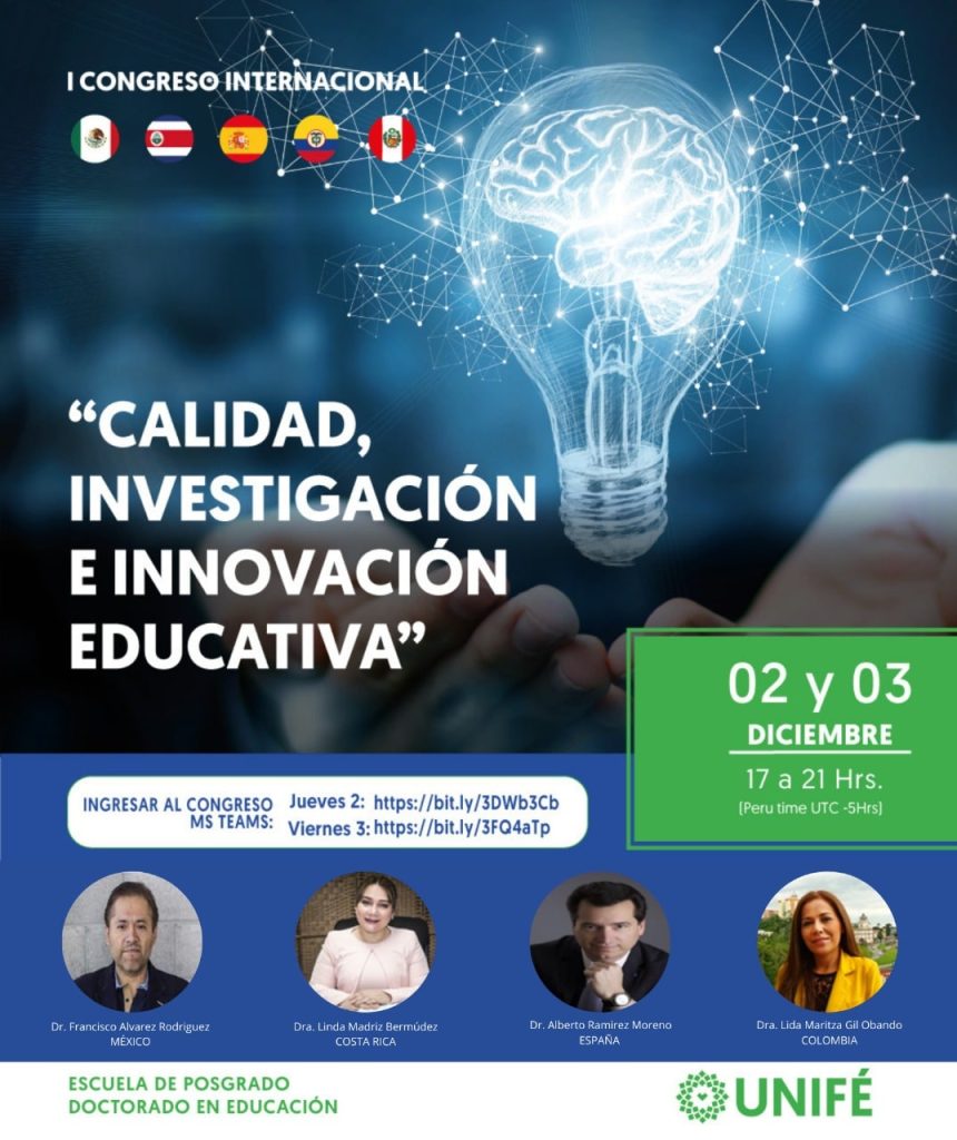 El Programa de Doctorado de Educación, en cumplimiento de su misión, visión institucional y las políticas institucionales celebra el I Congreso Internacional “Calidad, investigación e Innovación Educativa”, dirigido a miembros de la comunidad universitaria de la UNIFÉ y público en general, evento académico que sentará las bases para desarrollar proyectos de investigación y producir resultados relevantes en el campo de innovaciones educativas en la educación superior, asimismo permitirá conocer experiencias relacionadas con la calidad educativa.